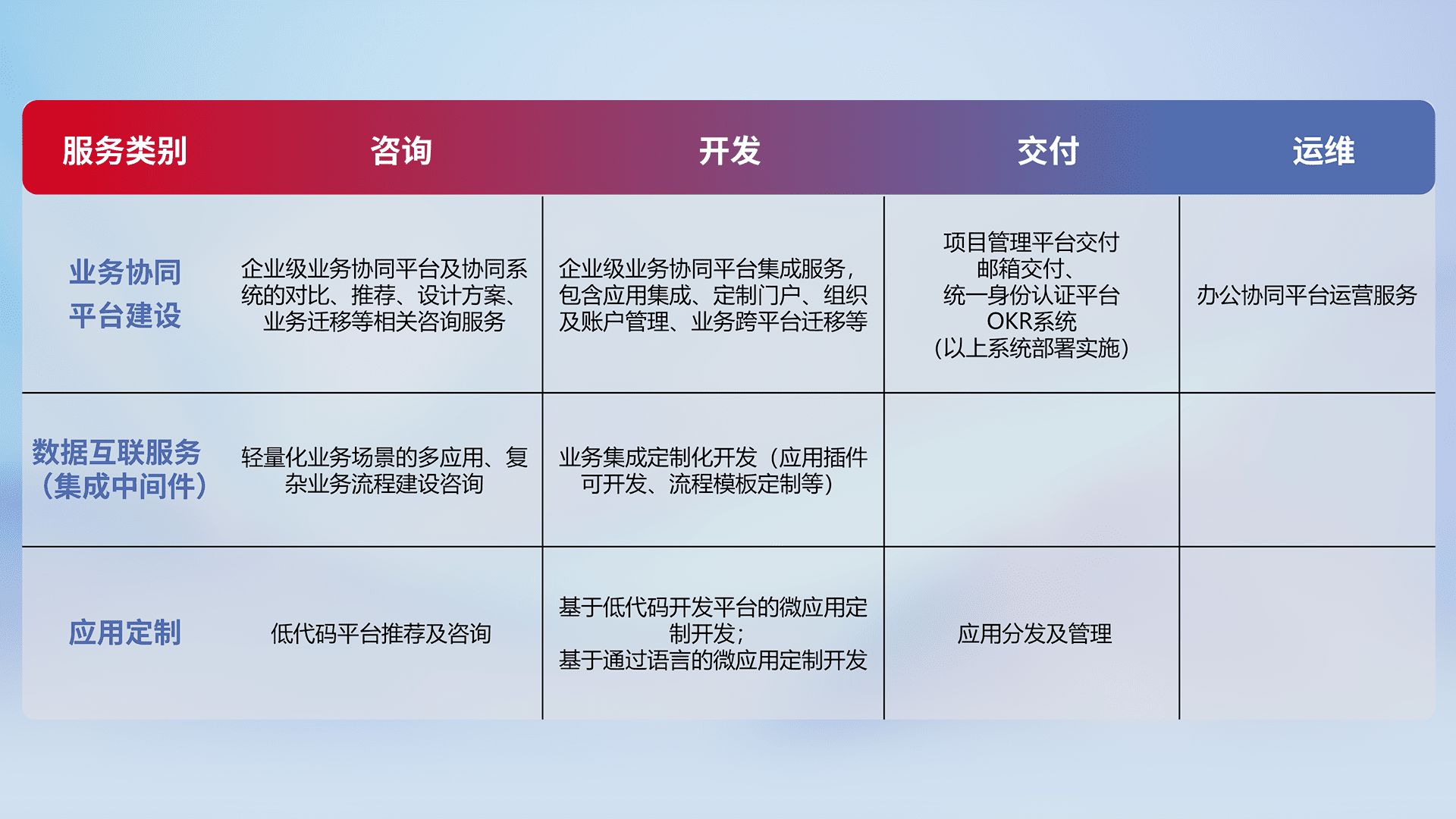 针对钉钉、、企微、、、、IDaas等平台级产品提供产品的规划、、方案、、、交付、、定制化开发等服务,,,实现如统一协同办公、、智能客户服务、、混合会议管理、、、智能数据查询、、等业务场景,,,实现数字化转型。。。